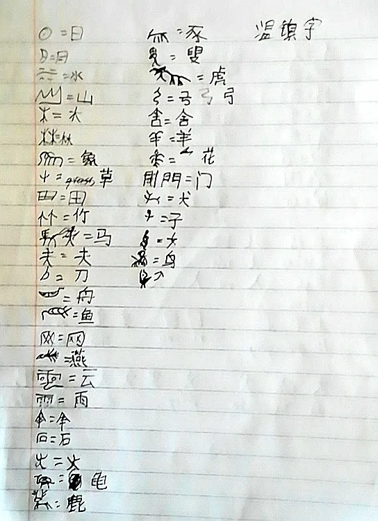 由于此前大量的中文阅读和影视欣赏,认读汉字对镇宇来说不是难事儿,但对从未接触过汉字演变和发展过程的镇宇来说,关于象形字的介绍令他耳目一新。像一幅画一般的象形字,随着时间的流淌,最后定型成一个个方块字,镇宇觉得好奇又惊喜,写了很多”图文并茂”的汉字笔记。
